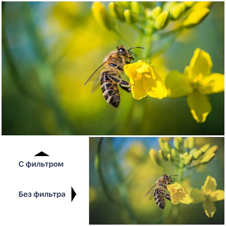 UV фильтры уменьшают лишнее излучение, что попадает на матрицу, благодаря чему вы сможете избавиться от световой дымки. Модель имеет специальное покрытие, сокращающее количество бликов, а также повышающее пропускную способность